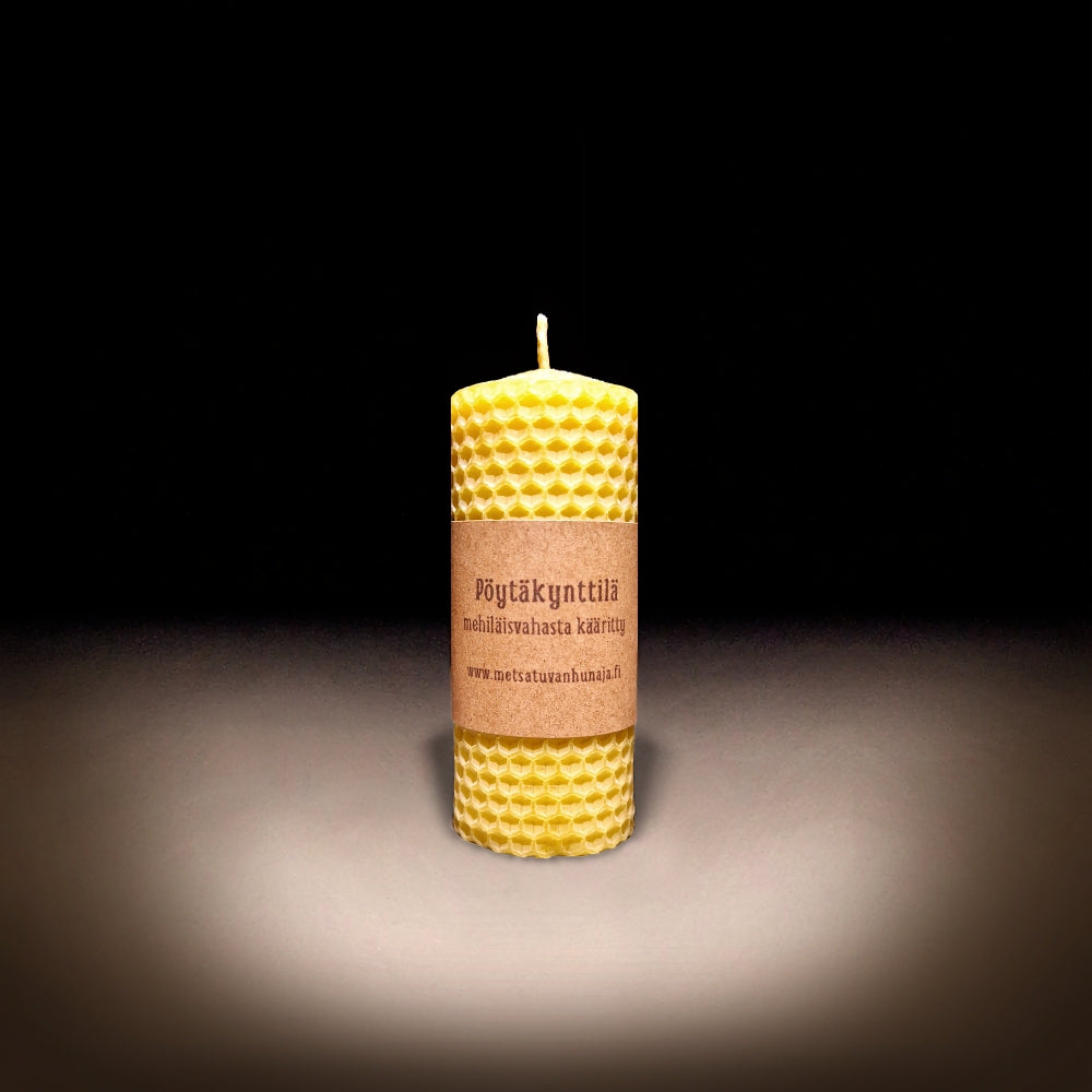 Puhtaasta kotimaisesta mehiläisvahasta kääritty pöytäkynttilä, joka ei sisällä väriaineita tai hajusteita. Kynttilä tuoksuu miedosti hunajaiselta mehiläisvahalta.