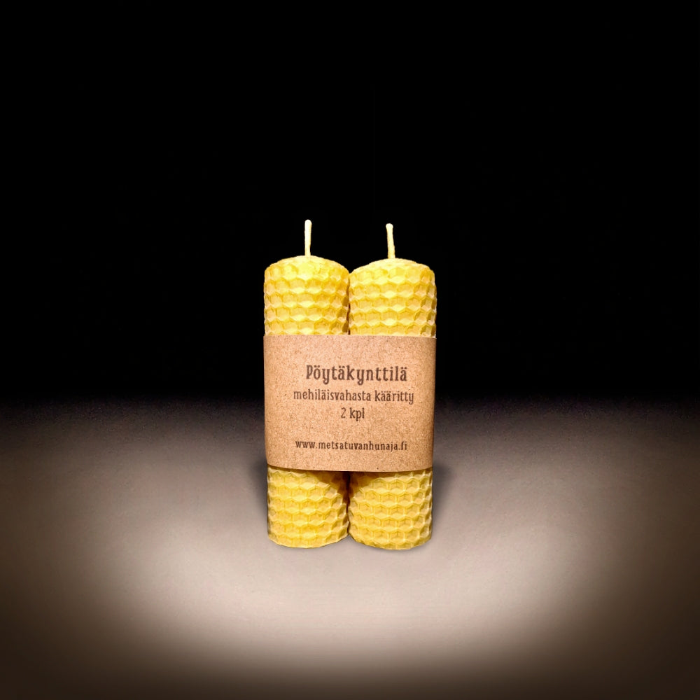 Puhtaasta kotimaisesta mehiläisvahasta käärittyjä pöytäkynttilöitä, jotka eivät sisällä väriaineita tai hajusteita. Kynttilät tuoksuvat miedosti hunajaiselta mehiläisvahalta.