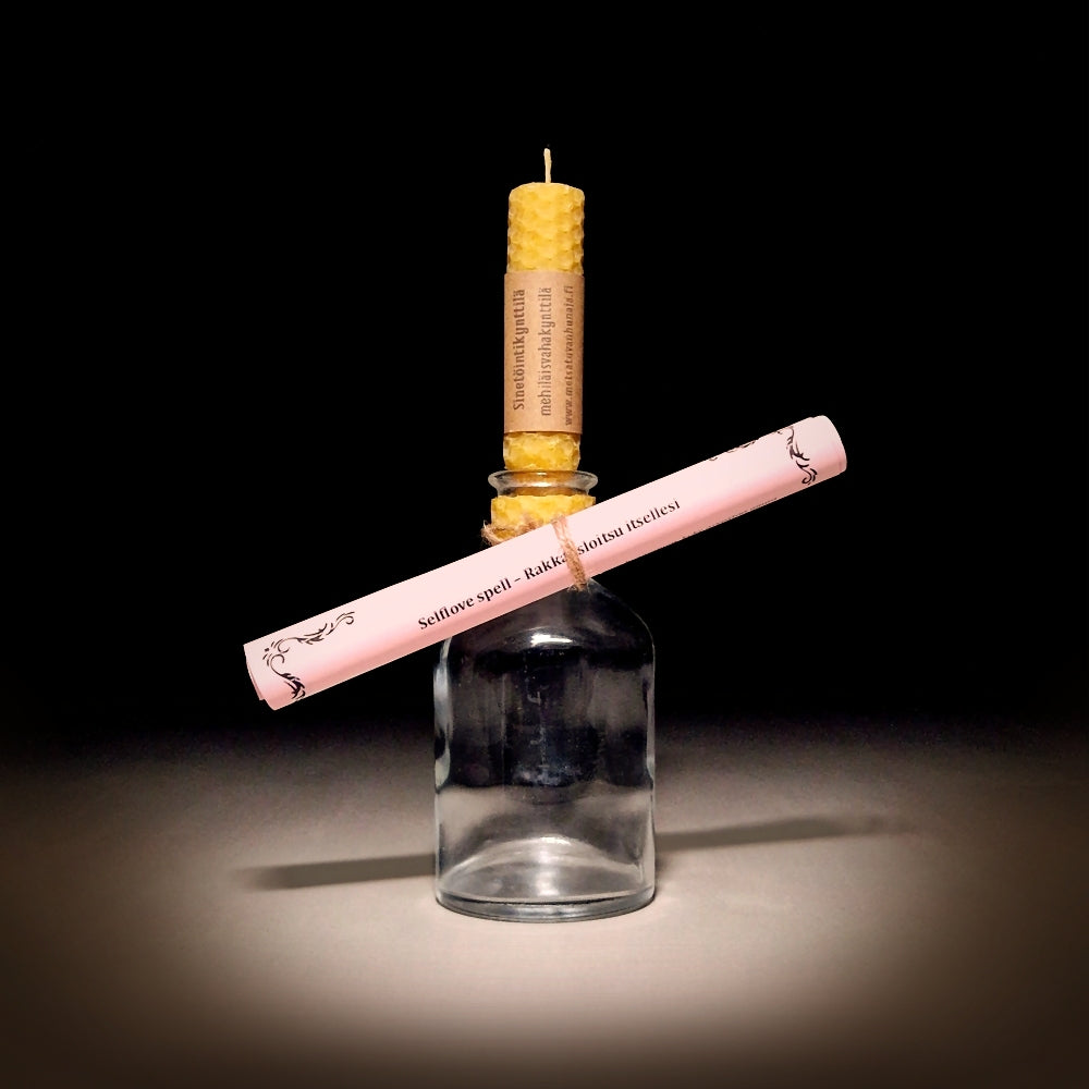 Tuliko mieleesi ystävä, joka ansaitsisi lisää itsemyötätuntoa ja itseluottamusta? Rakkausloitsu itsellesi -paketti on lämpimän liekin lailla loistava ja pehmeästi mehiläisvahalta tuoksuva erinomainen lahjaidea.